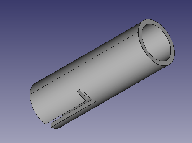 The third part translated much easier from my head to the computer and is a pretty simple idea. Basically it a cylinder with 2 parallel cutouts that go down its side, and then mirrored cutouts that go horizontally across it. The second object is a T shaped structure that is meant to go down the vertical cutouts and then turn into the mirrored horizontal cutouts and lock in like that. Here it is:
